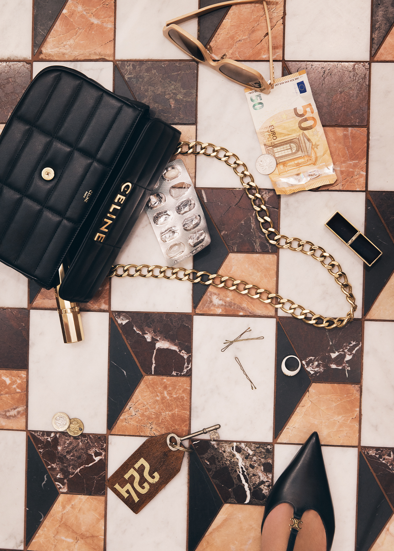 CHAIN SHOULDER BAG MATELASSE MONOCHROME CELINE IN QUILTED GOATSKIN, SHOP NOW, SUNGLASSES, SHOP NOW, TRIOMPHE LARGE RING IN BRASS WITH GOLD FINISH & VARNISH, SHOP NOW, CELINE KITTEN WITH TRIOMPHE T-BAR STRAP IN CALFSKIN, SHOP NOW, CELINE